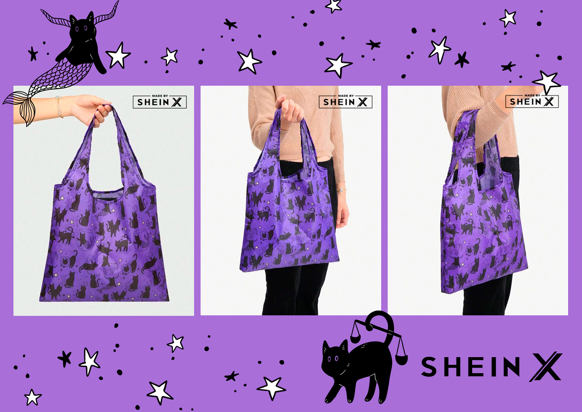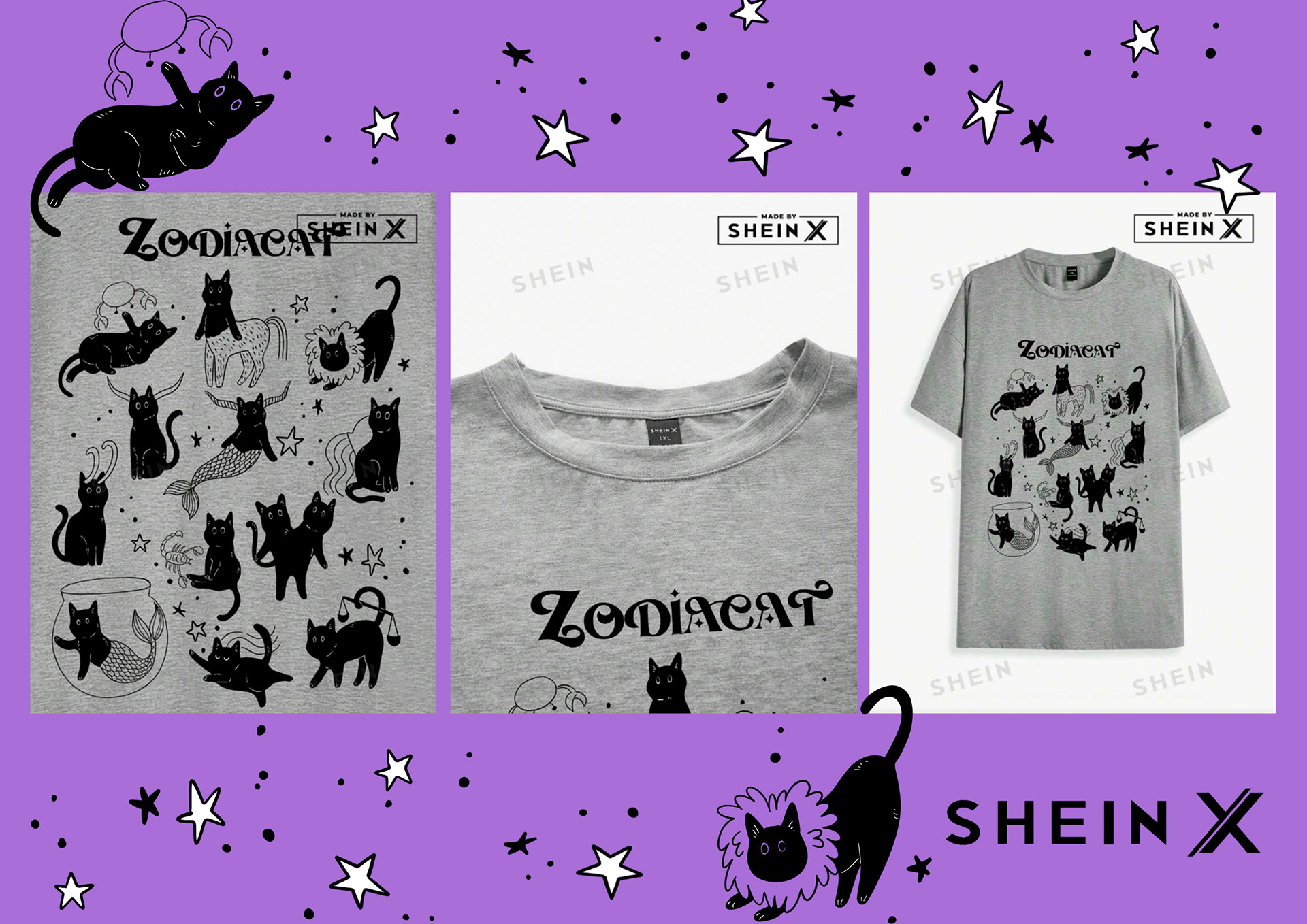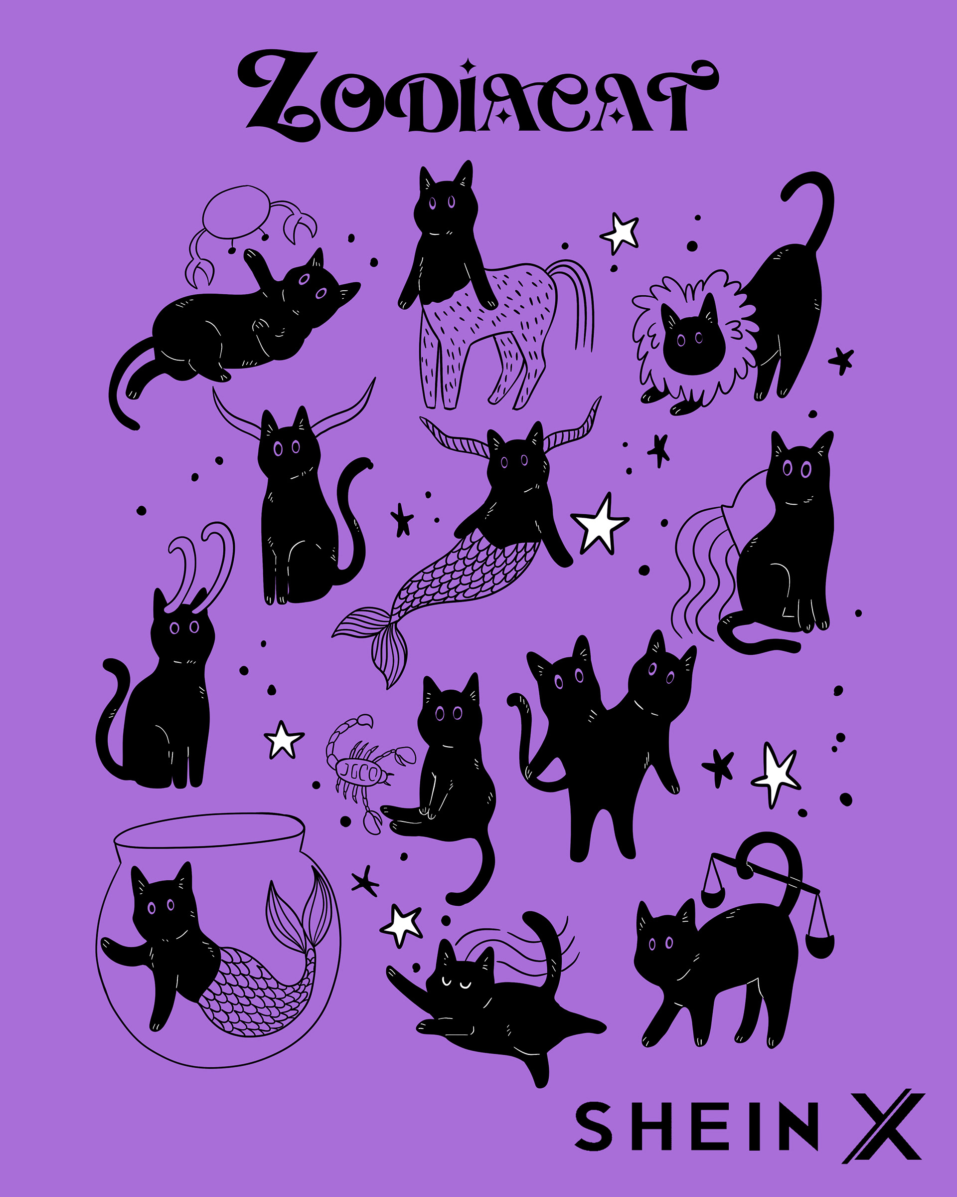Shein invited me to develop a fun and creative print using cats as the main characters for this art, and I chose to mix cats and the Zodiac. All products with the art can be found on the official Shein online shop.
